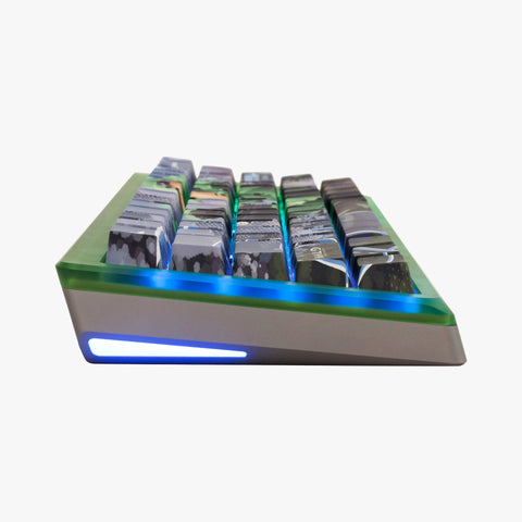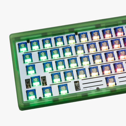 Our 65% keyboard (dedicated arrow keys) with dye-sub PBT keycaps. Features a CNC aluminum bottom case and transparent polycarbonate top, gasket-mounted design, and HG Blitz switches.